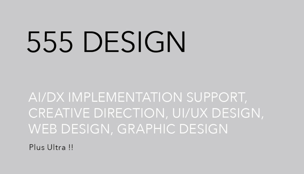 “Vision”に掲げている“日常生活にデザインを浸透させる”の実現に向けて、ビジネスにおけるデザインのチカラを最大化したいという想いから、数秘術で“変化”や“変革”を意味する“555”と“デザインとビジネスの融合”を意味する“DESIGN”とを掛け合わせて“555 DESIGN”と命名しました。読み方は“トリプルファイブデザイン”とし、多様化する社会に適応すべく、特定のロゴは持たない方針で臨機応変に“変化”させていく予定です。